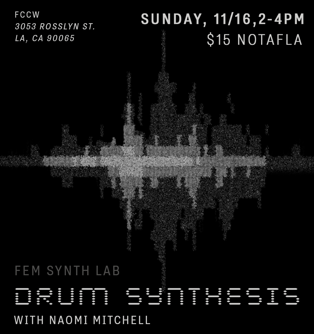 Synthesizing Drums with Naomi Mitchell Sunday, November, 16, 2–4PM FCCW: 3053 Rosslyn St. LA CA 90065 Info on our space here Max Participants: 15 Cost: $10, if this isn’t accessible please reach out at femsynthlab@gmail.com